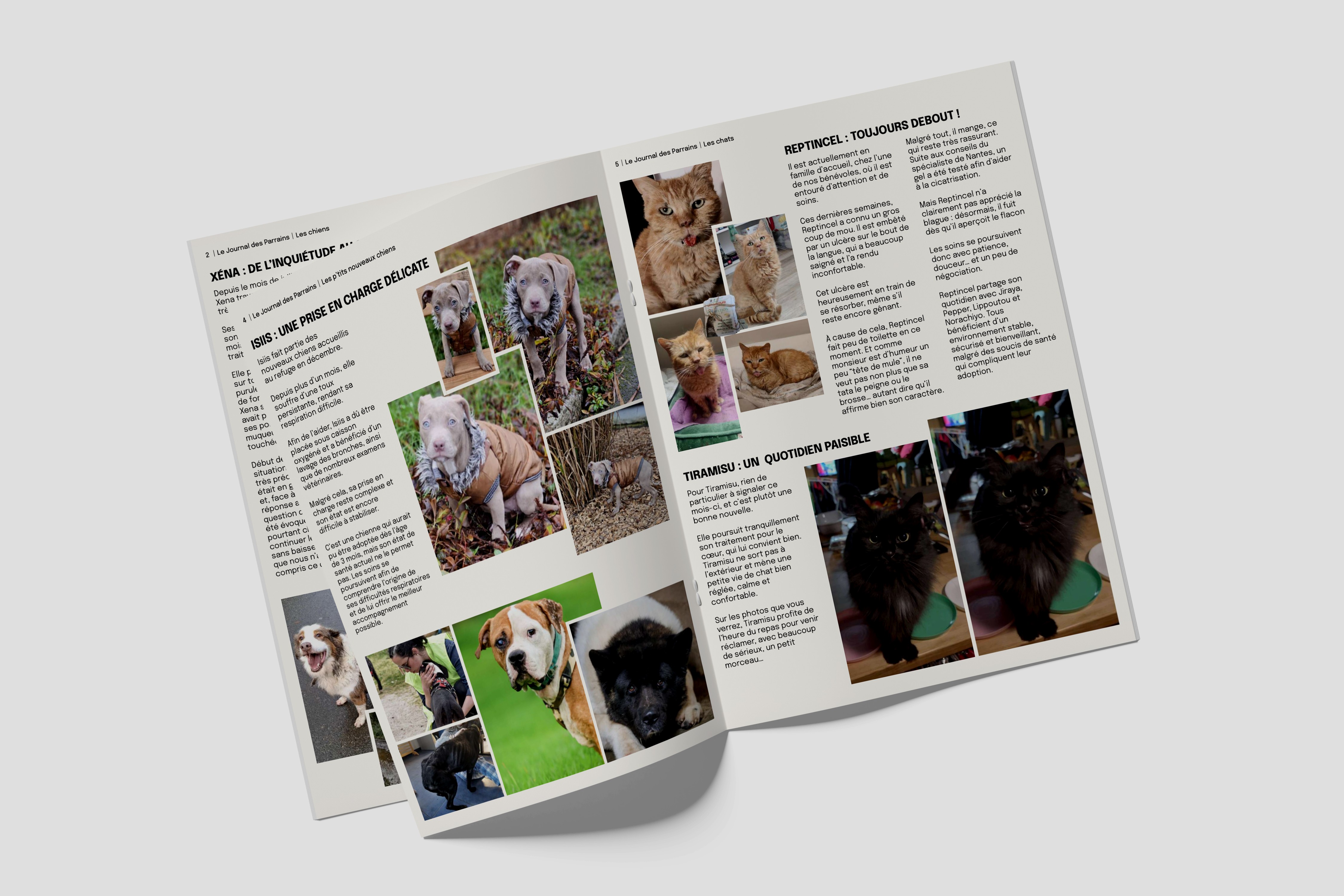 Je conçois et réalise une newsletter mensuelle, pensée comme un véritable journal destiné aux parrains et marraines. Ce support regroupe des informations essentielles sur les animaux parrainés (chiens et chats), leur évolution, leur quotidien au sein de l’association, ainsi que les actualités du programme de parrainage.