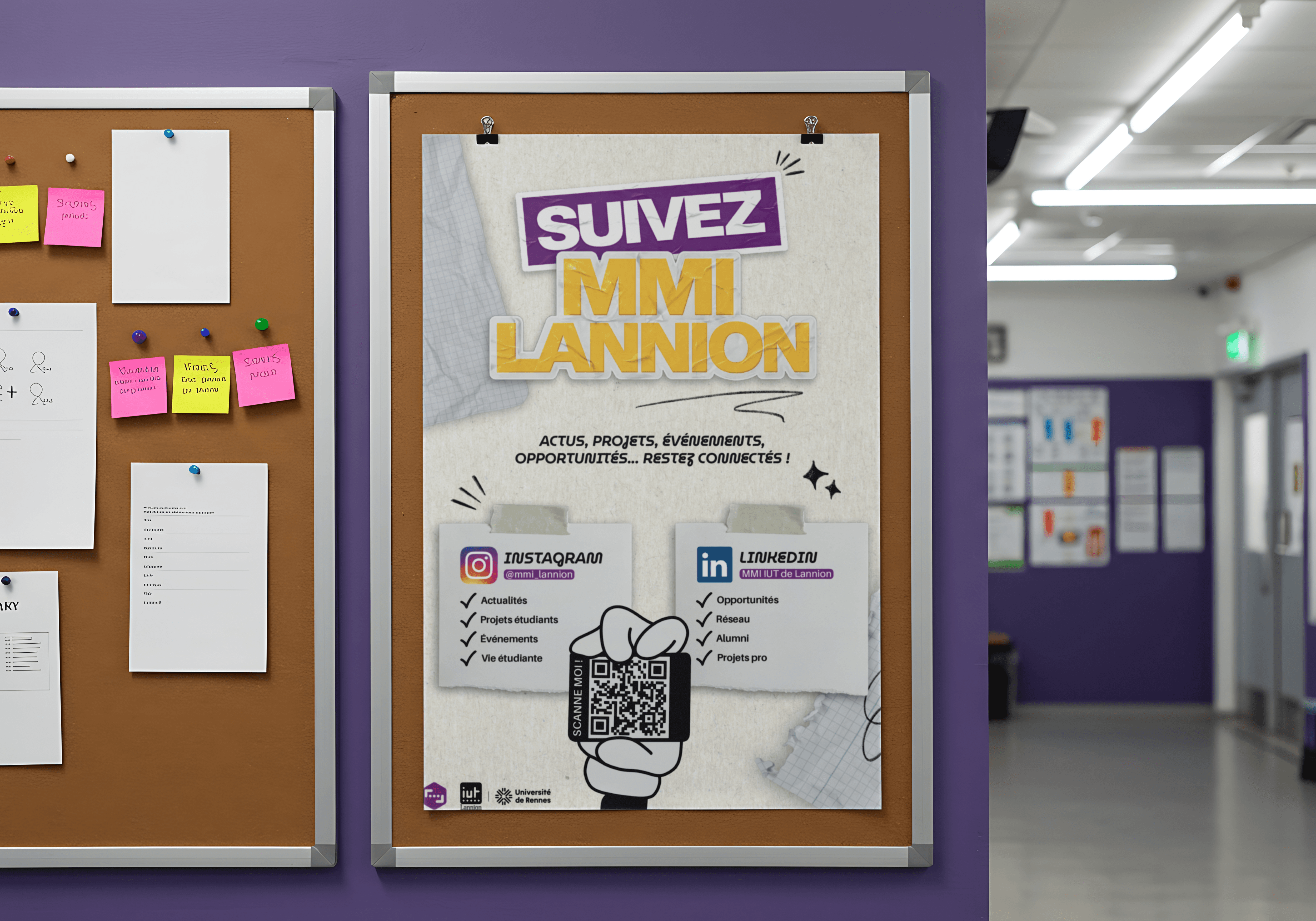 L’affiche a été pensée comme un levier d’engagement, avec pour objectif d’inciter les étudiants, professeurs et membres du département à suivre et consulter régulièrement les comptes Instagram et LinkedIn.