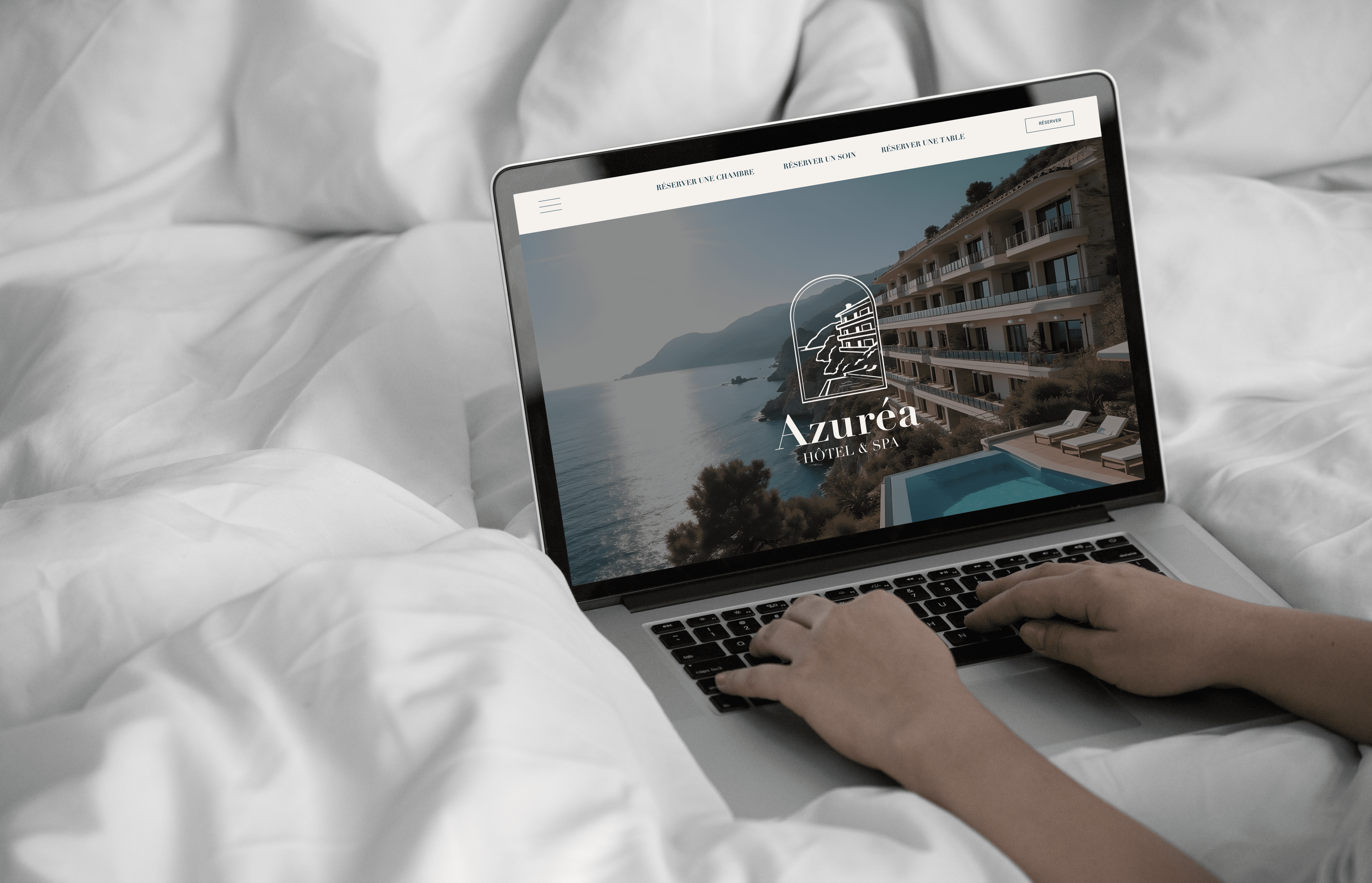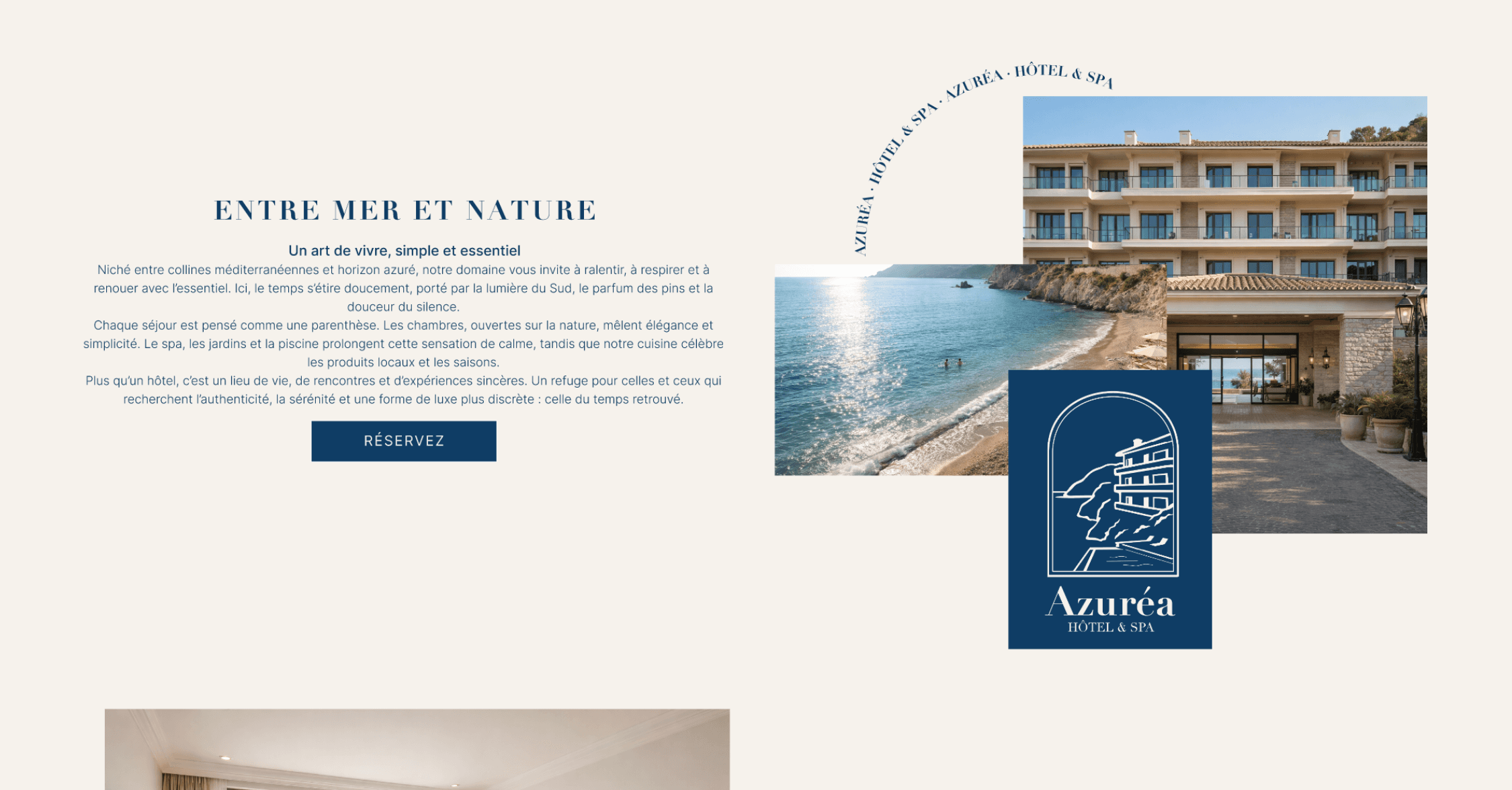 Azuréa est un projet fictif imaginé autour de la création d’un hôtel de luxe en bord de Méditerranée. L’objectif était de concevoir la première page d’un site immersif, capable de transmettre une émotion forte dès les premières secondes et de refléter les standards de l’hôtellerie haut de gamme.